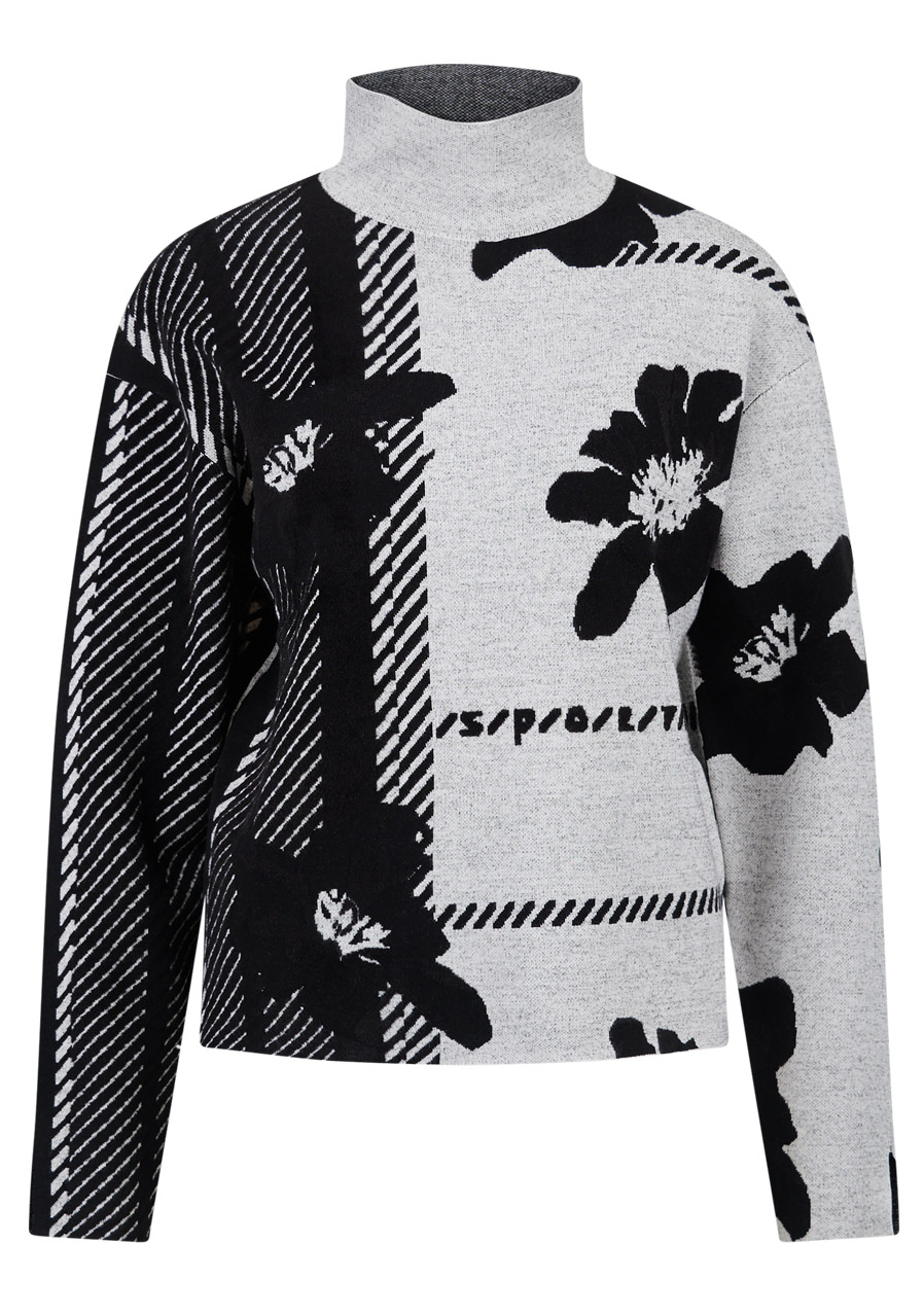This soft turtleneck sweater with an extravagant jacquard pattern is a stylish piece you'll love for its comfort and originality. The perfect choice for colder days when you want to look elegant and feel cozy.