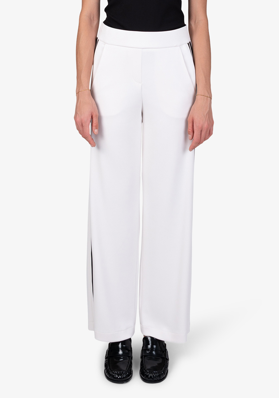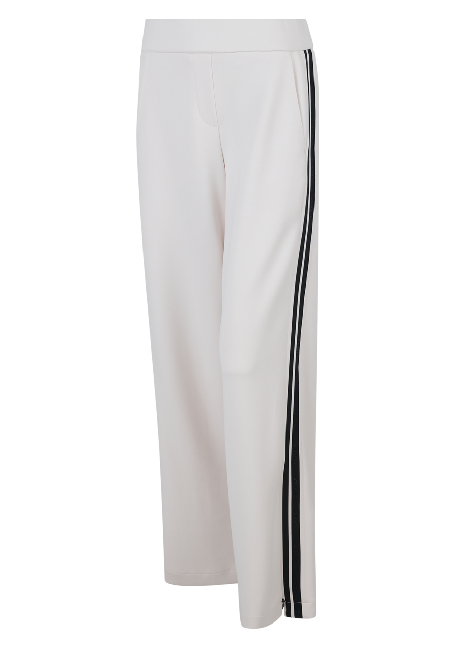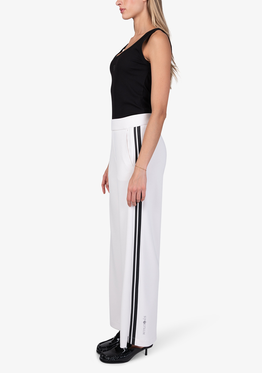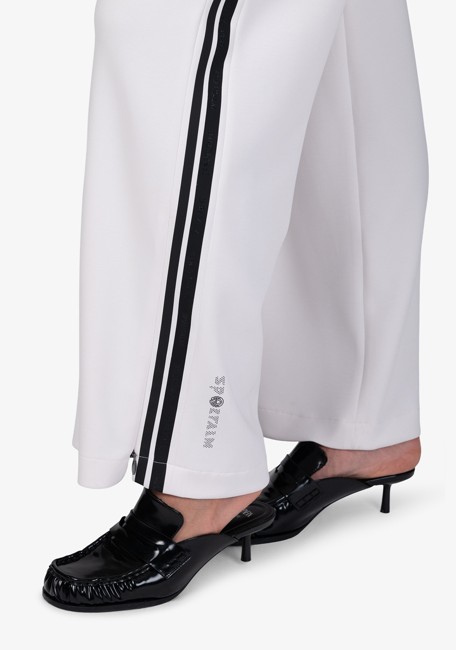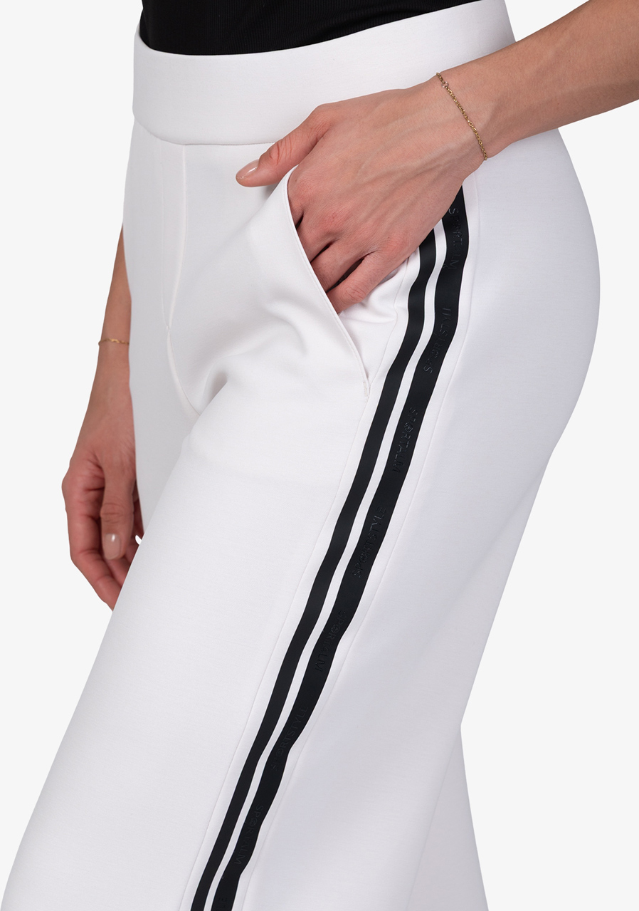 Material: 54 % recycled polyester, 40 % modal, 6 % elastane, soft modal jersey Fit: casual Style: modern, sporty Waist: hidden elastic waistband Leg shape: wide Pockets: slanted pockets Highlights: side stripes, hidden zipper at hem to adjust width, Sportalm logo on the back of the left leg Inseam length for size 36: 80.0 cm