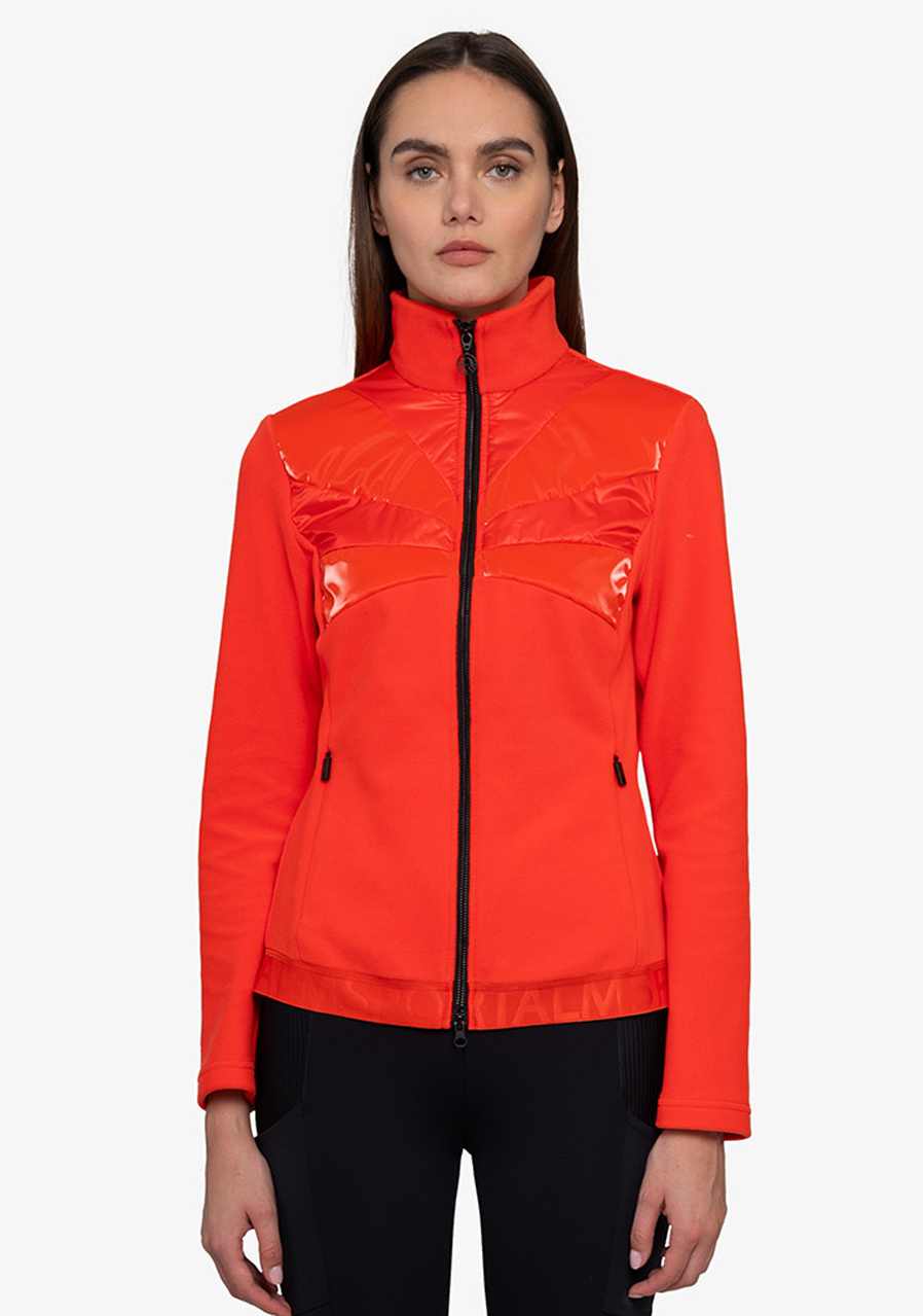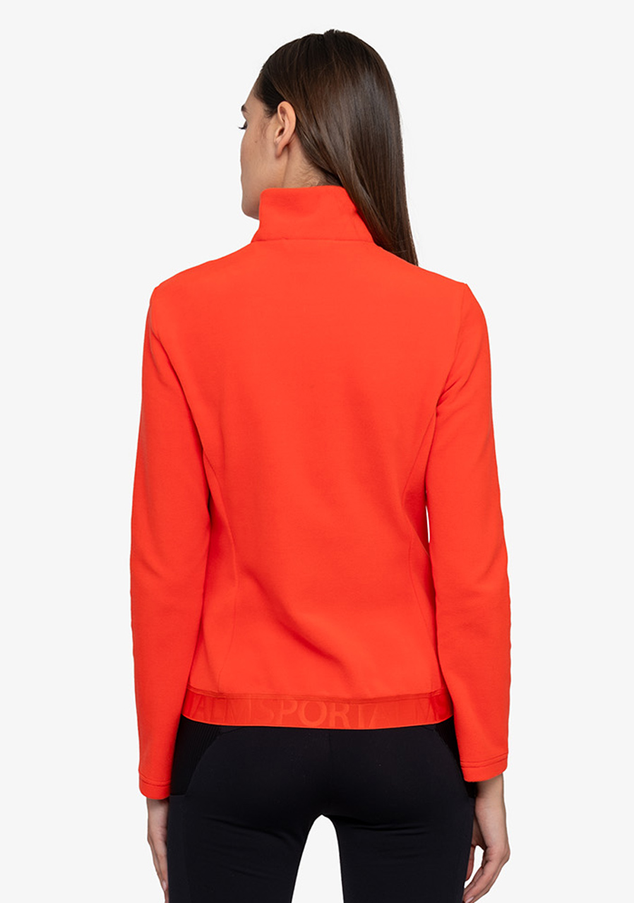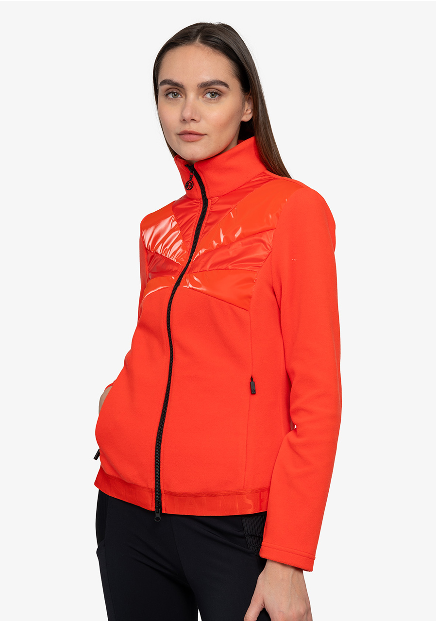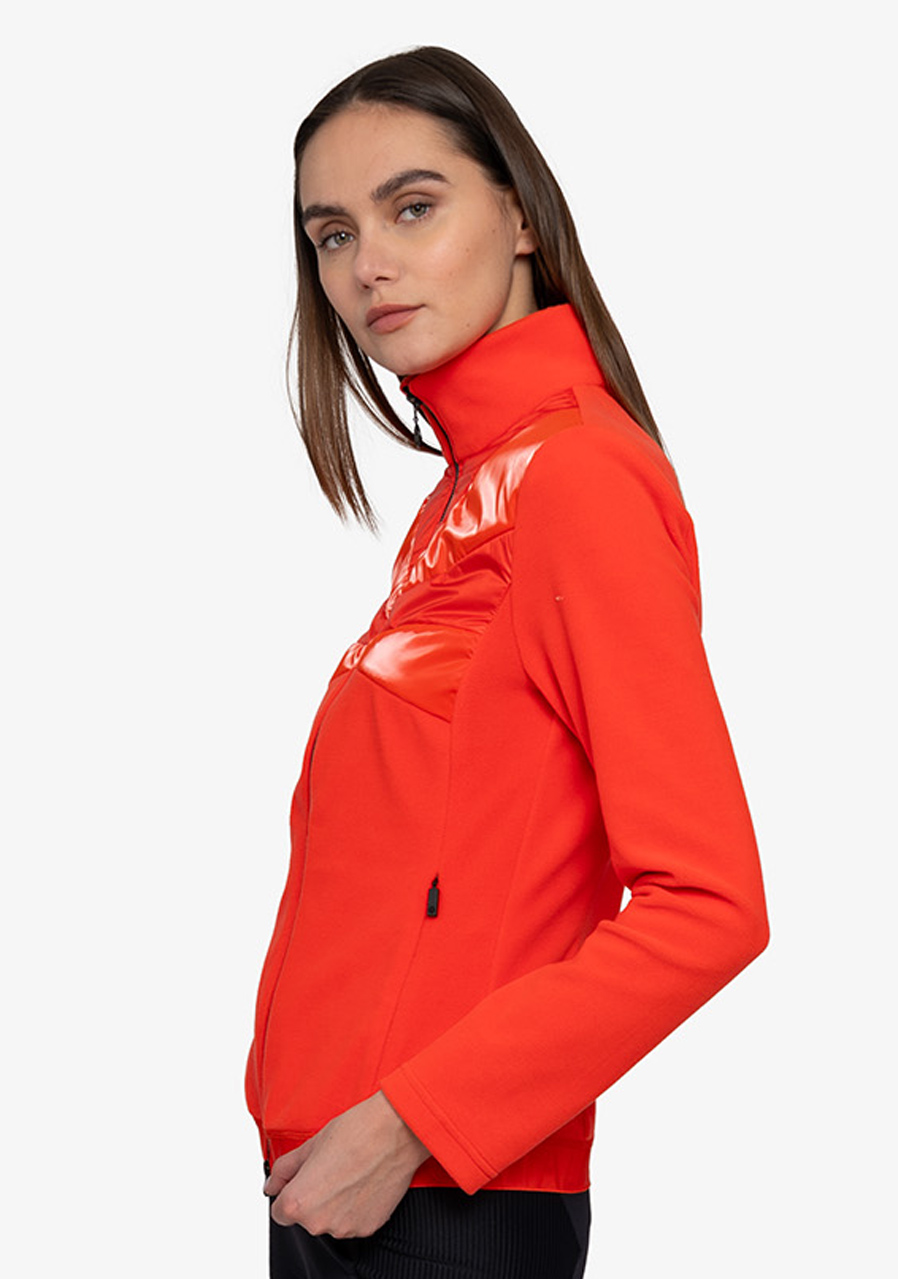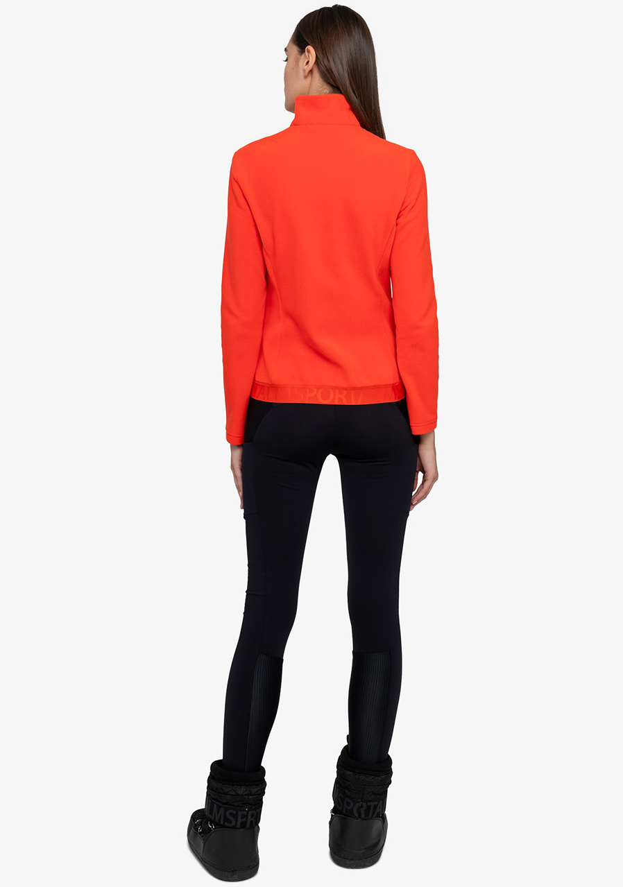 Představujeme vám dámskou fleecovou mikinu Sportalm v živé barvě Paprika Flame, která kombinuje dynamický styl s maximálním pohodlím. Tato mikina je vyrobena z vysoce kvalitního recyklovaného polyesteru (93%) s příměsí elastanu (7%), což zajišťuje pružnost a příjemný pocit při nošení