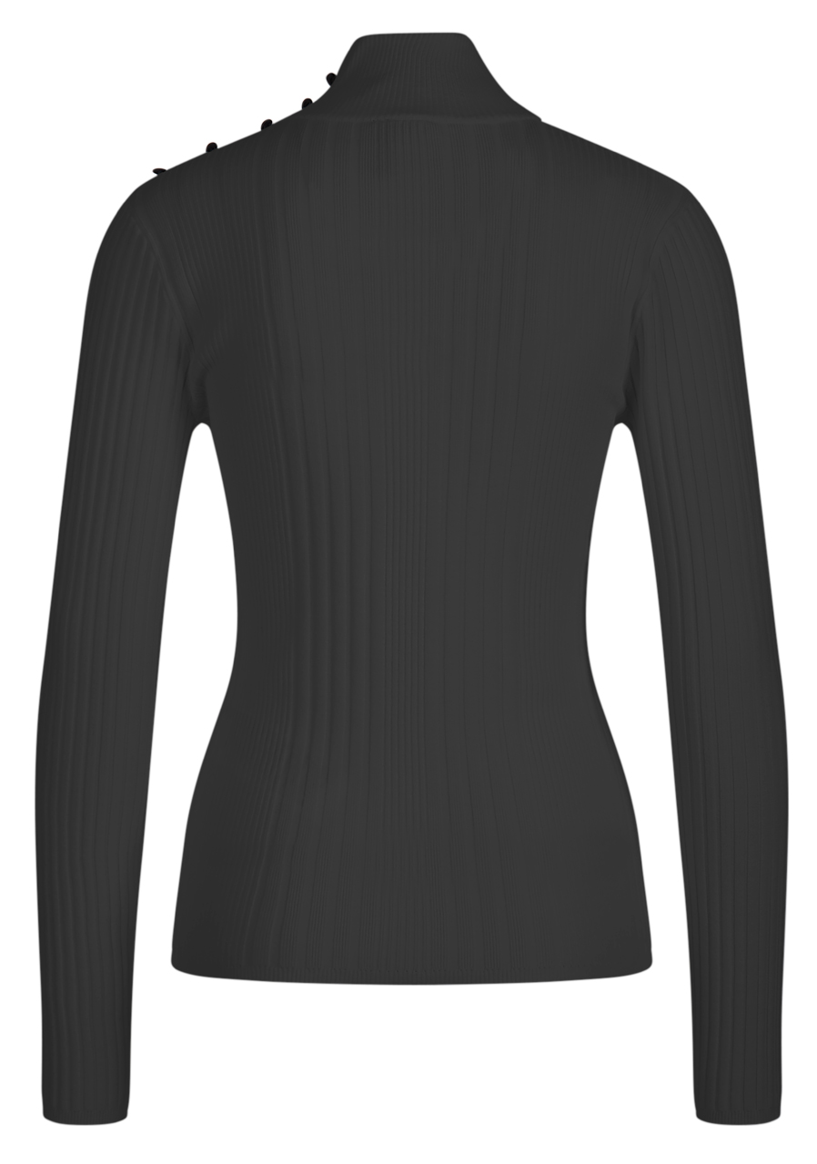 - detail ploché knoflíkové légy na levém rameni zdobené černými kovovými knoflíky
