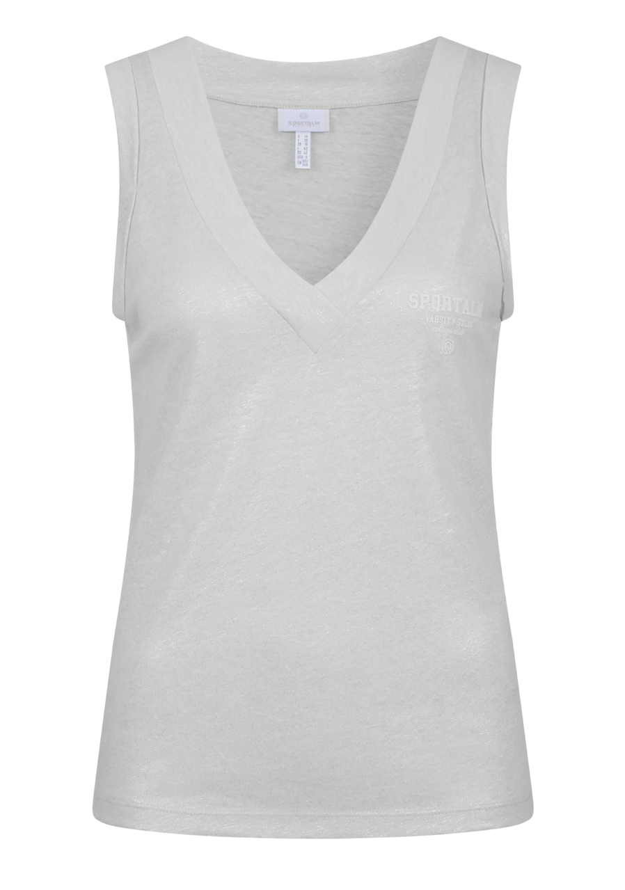Další parametry: Přiléhavý střih, elegantní styl, véčkový výstřih s širokým panelem, bez rukávů, flamé žerzej se stříbrným povrchem. Vyvýšený nápis Sportalm ve stylovém univerzitním stylu vpředu.