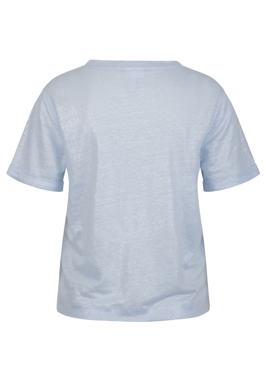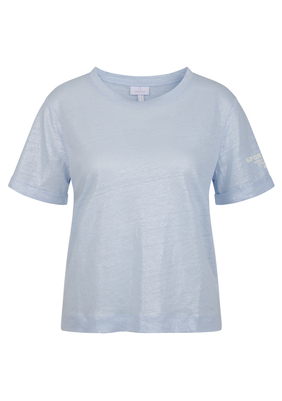 Tričko s kulatým výstřihem s krátkým rukávem je díky lehce třpytivému materiálu skutečným poutačem. Kombinuje nadčasovou eleganci s nádechem glamouru a je všestranná pro různé příležitosti.