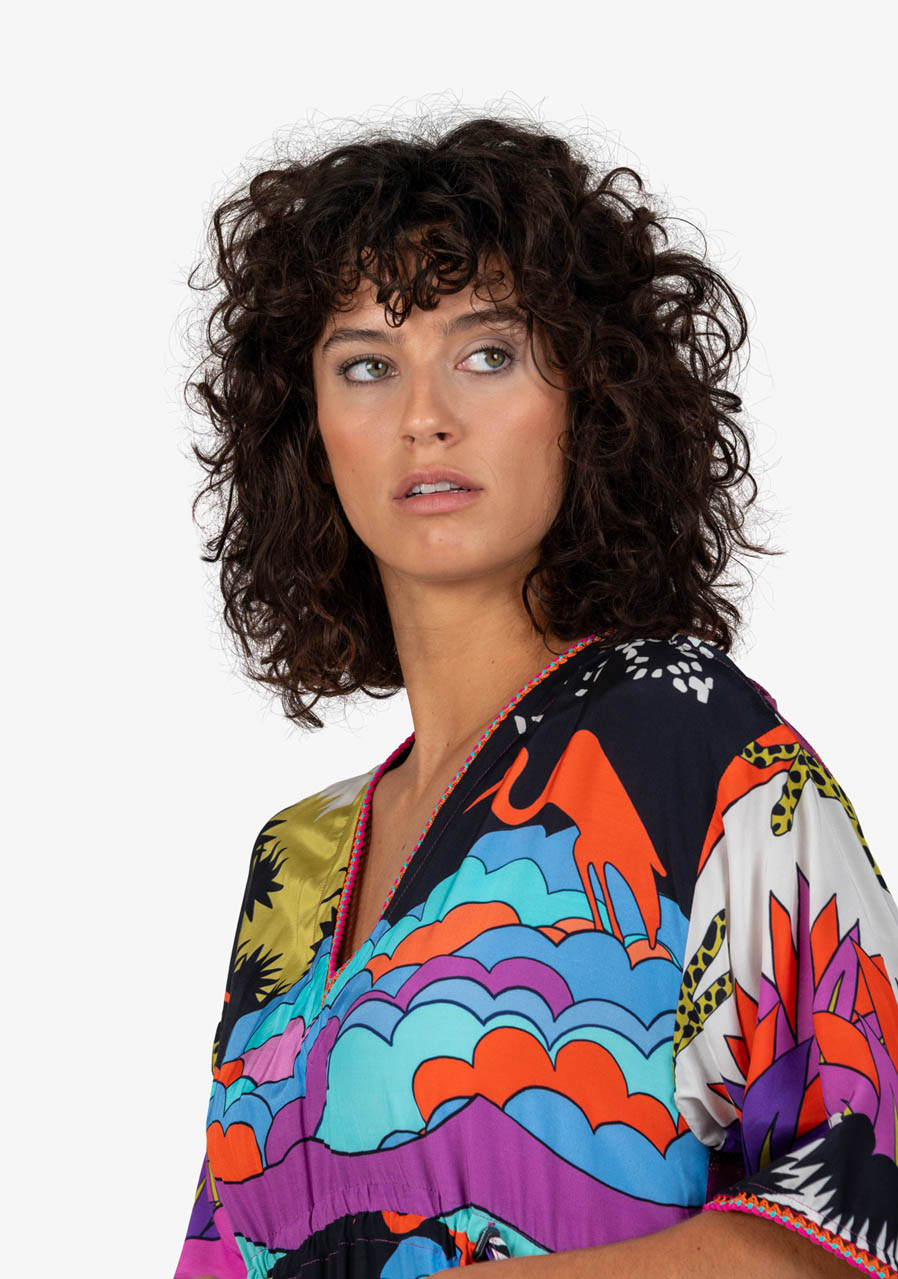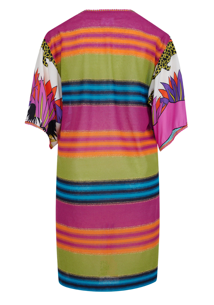 Vzor: barevný celoplošný potisk, pruhovaný úplet Střih: volný Styl: moderní, ženský Výstřih: do V Rukávy: zkrácené rukávy s širokým lemem a elastickým lemováním Zapínání: stahovací Zvýraznění: sofistikovaná šňůrka pr stažení v pase, boční rozparky