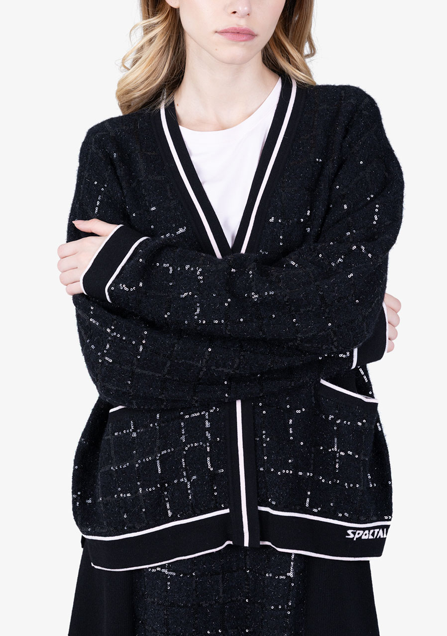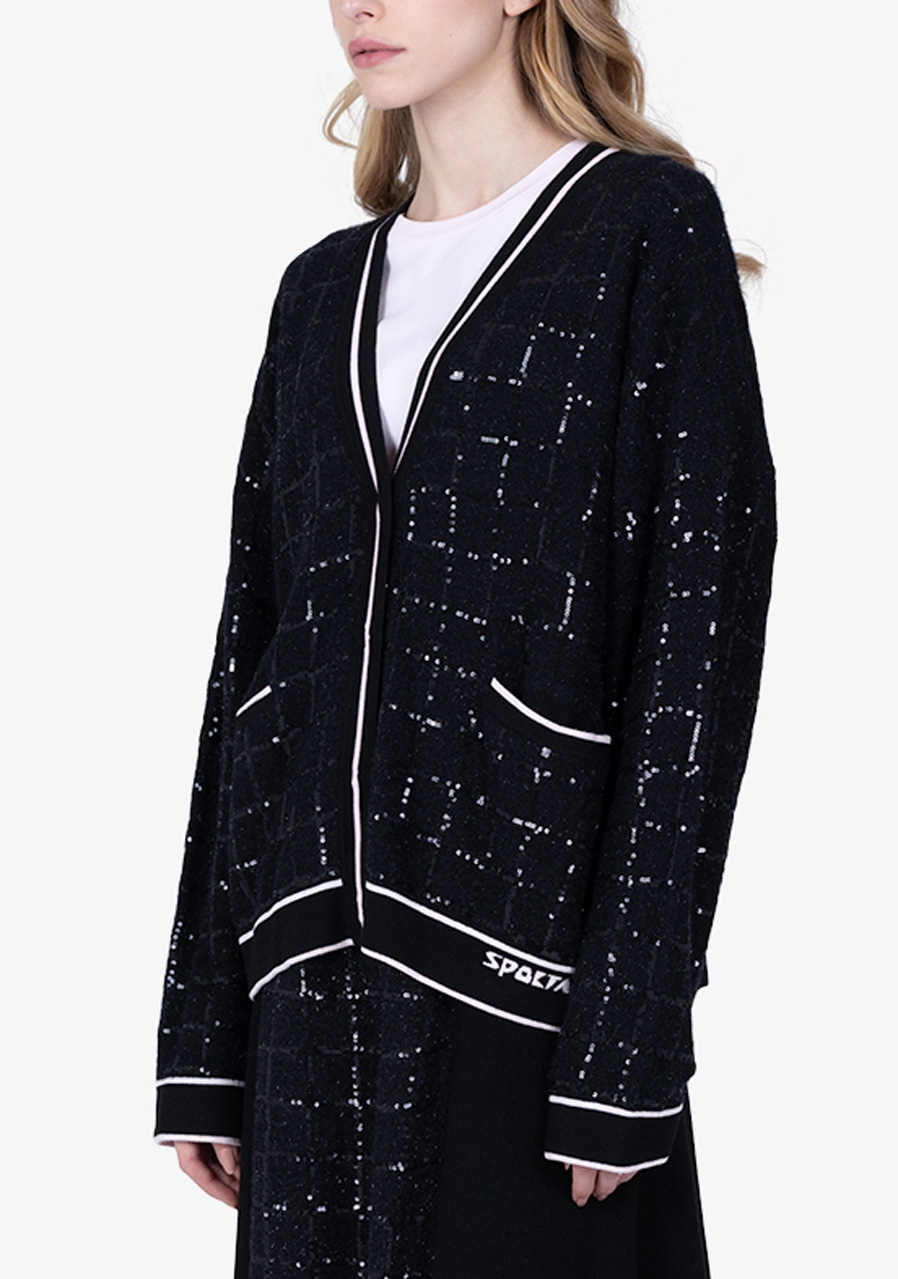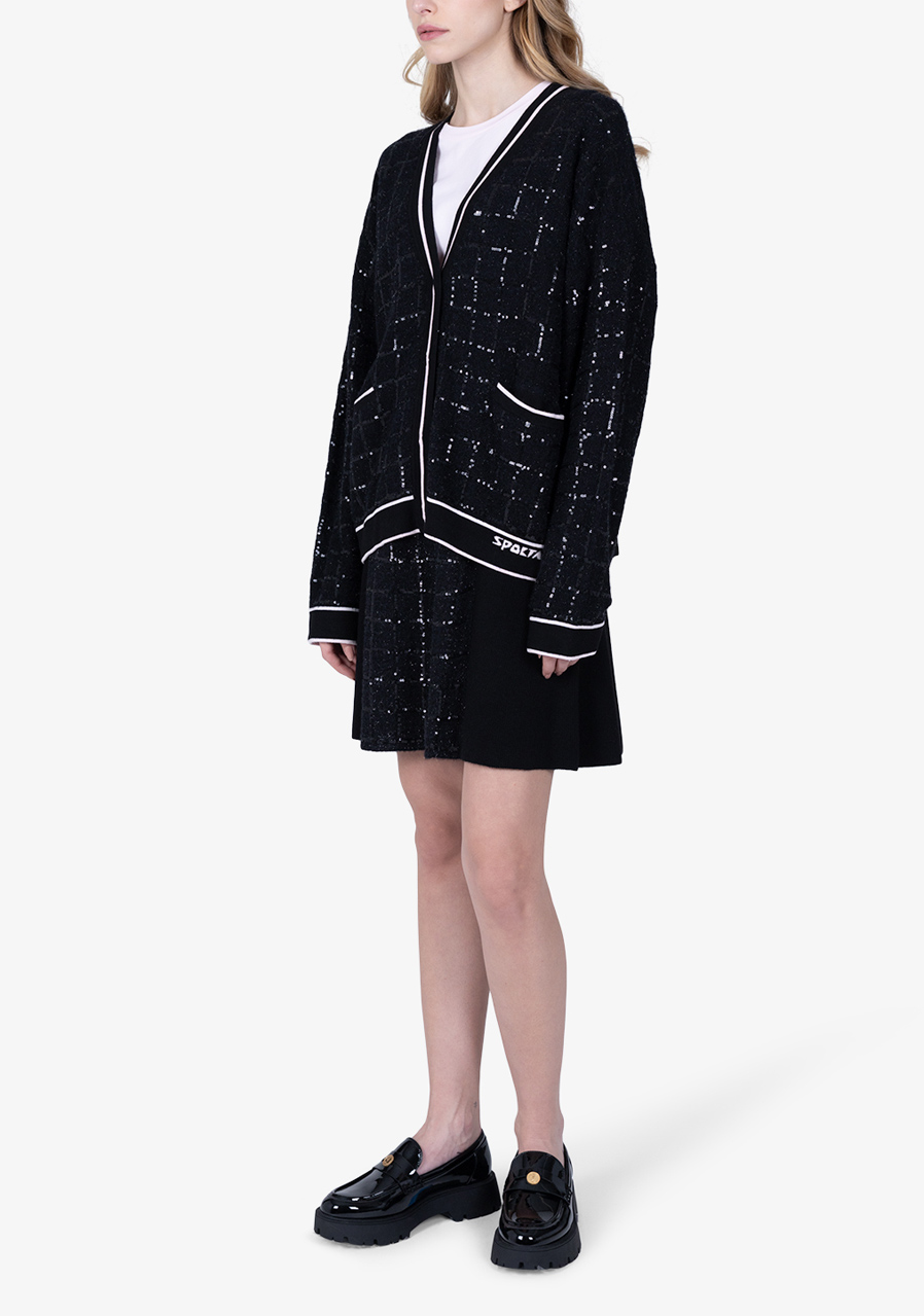 Details : checkered embroidery with sequins, contrasting hem with knitted Sportalm logo on the left, short side slits