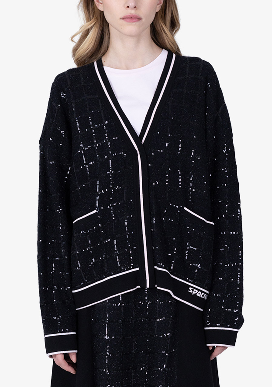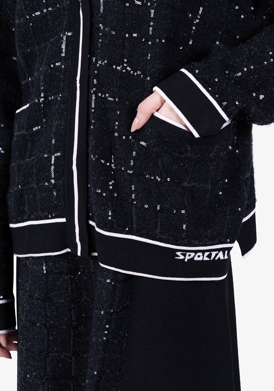 This knitted jacket is a real eye-catcher thanks to the spectacular lurex yarn, which gives the model a subtle shimmer and fashionable character. Made from a high-quality wool blend, it offers exceptional softness, warmth and pleasant wearing comfort. The loose cut with dropped shoulders looks relaxed and modern, while the contrasting striped trim on the neckline and cuffs adds a sporty-elegant touch. The metal press stud in the middle of the front serves as a minimalist fastening. Lined pockets and side slits increase practicality and comfort when moving. Subtle shimmering sequin details in check embroidery and the elaborate knitted Sportalm logo on the left side underline the premium workmanship.