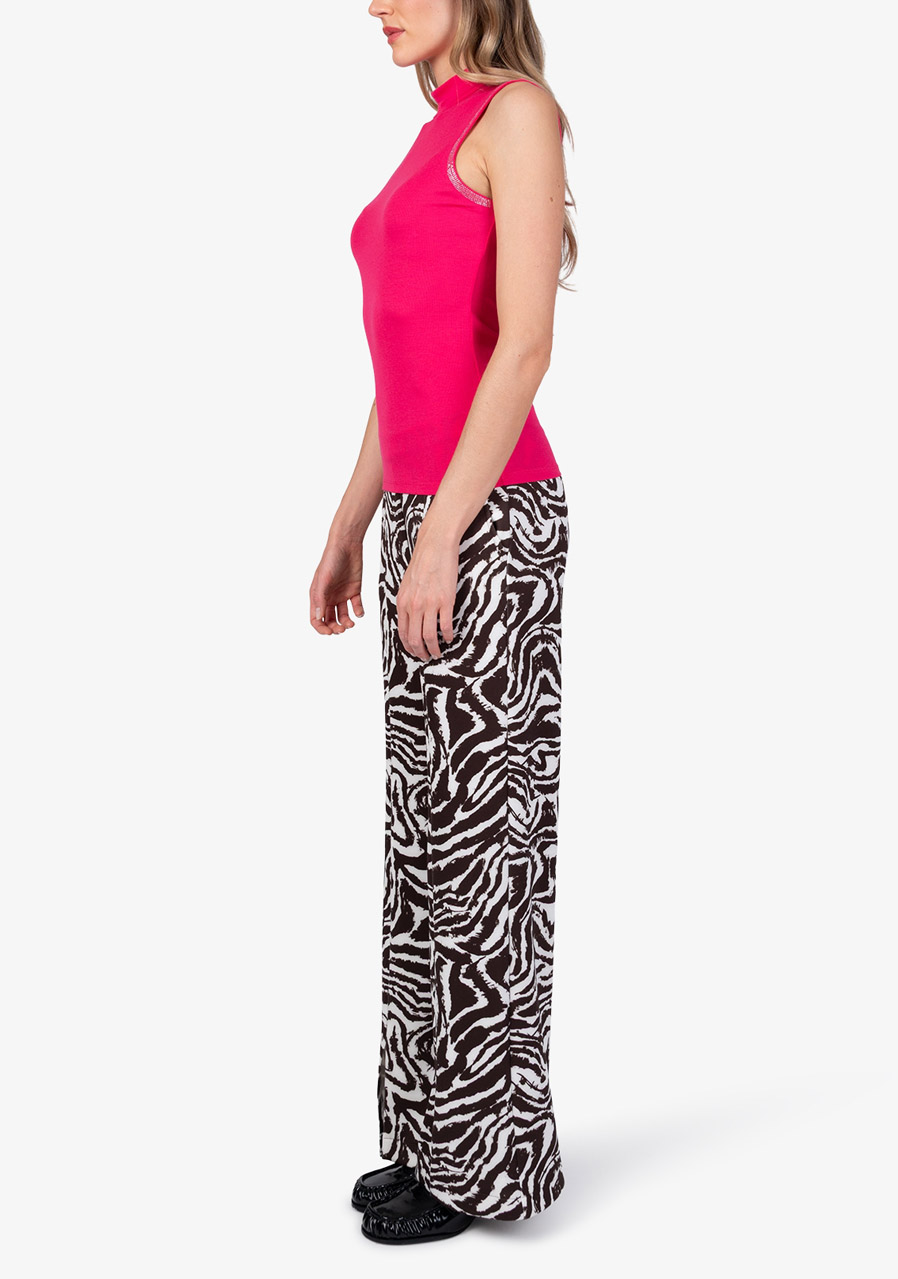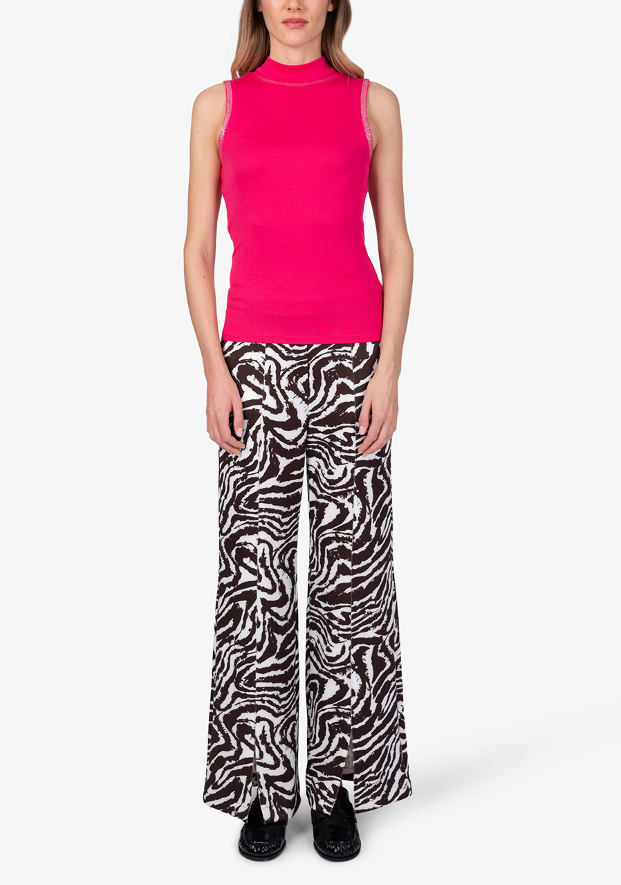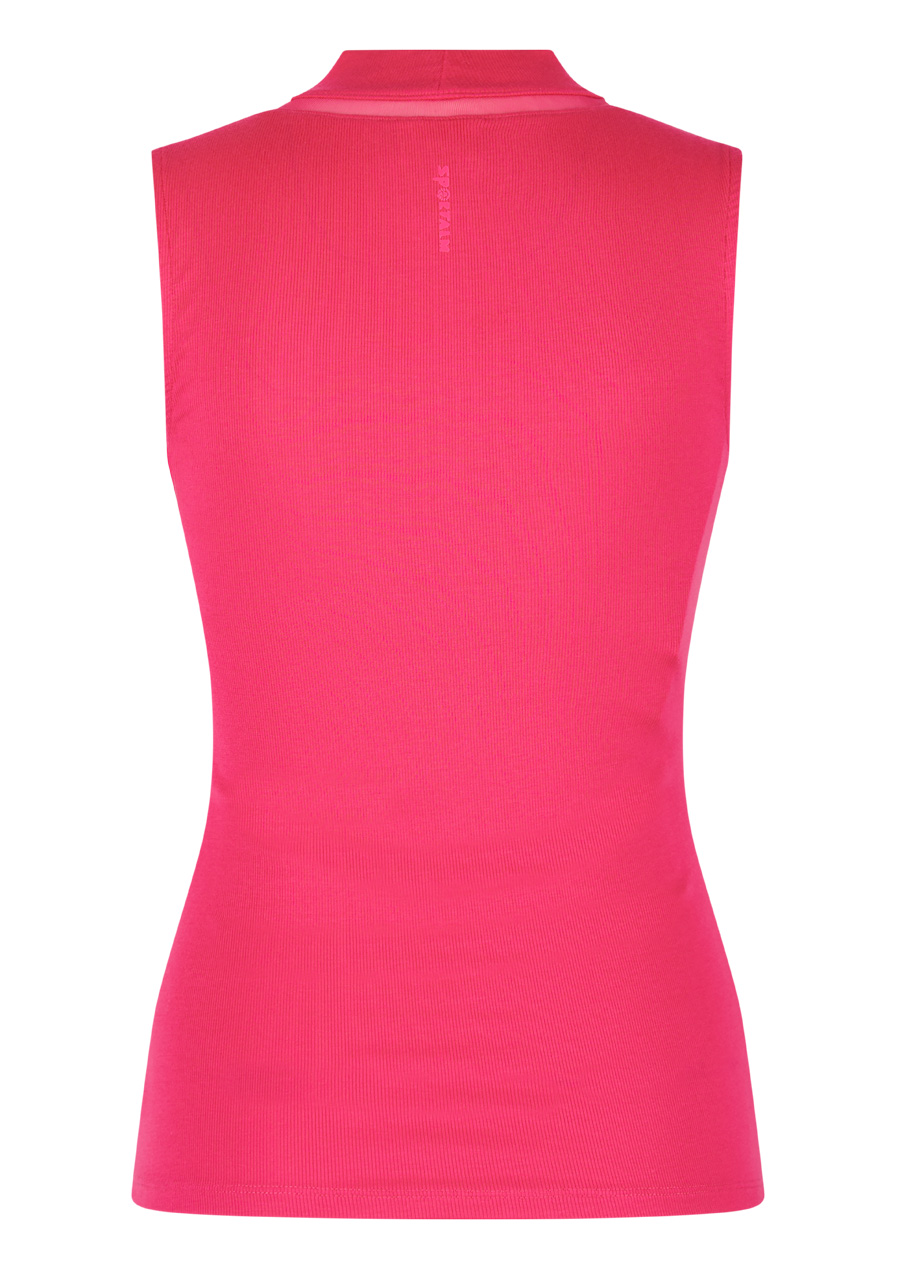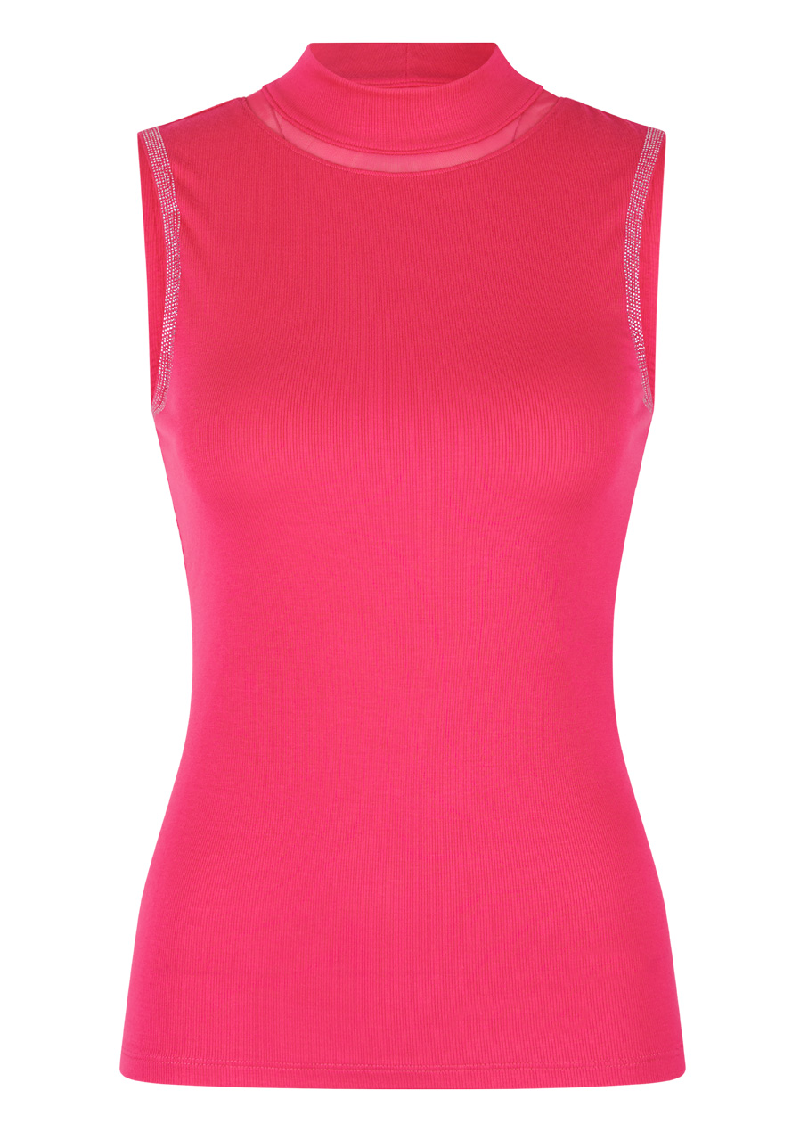 An elegant sleeveless top made of fine micro-modal rib knit impresses with its clean silhouette and luxurious details. The fitted cut beautifully accentuates the figure, while the stand-up collar with a transparent insert at the seam gives the model a sophisticated, modern touch. A striking element is the glittering decorative stones on the armhole in the front, which act like stylish jewelry and add feminine elegance to the outfit. The subtle Sportalm silicone print on the back under the stand-up collar underlines the premium character of this piece.