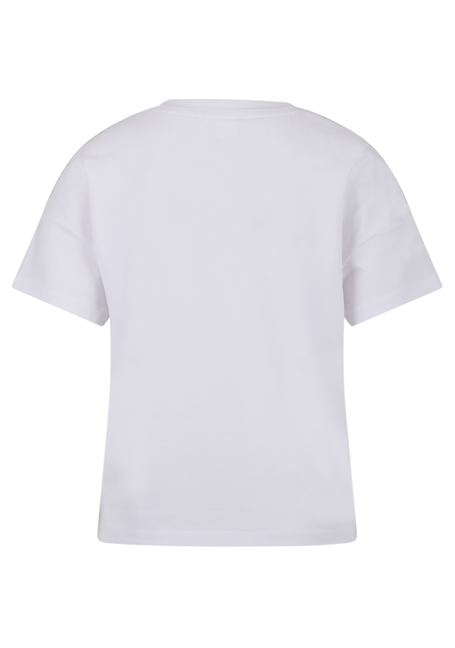 Additional parameters: Material: cotton jersey Fit: straight Style: fashionable, feminine Neckline: round Sleeves: short, loose sleeves with dropped shoulders Highlight: printed fashion motif with foil effect and sparkling rhinestones, metal chain detail on shoulder seams, small side slits