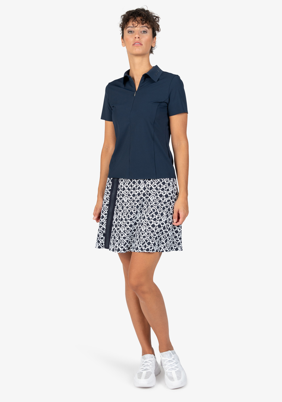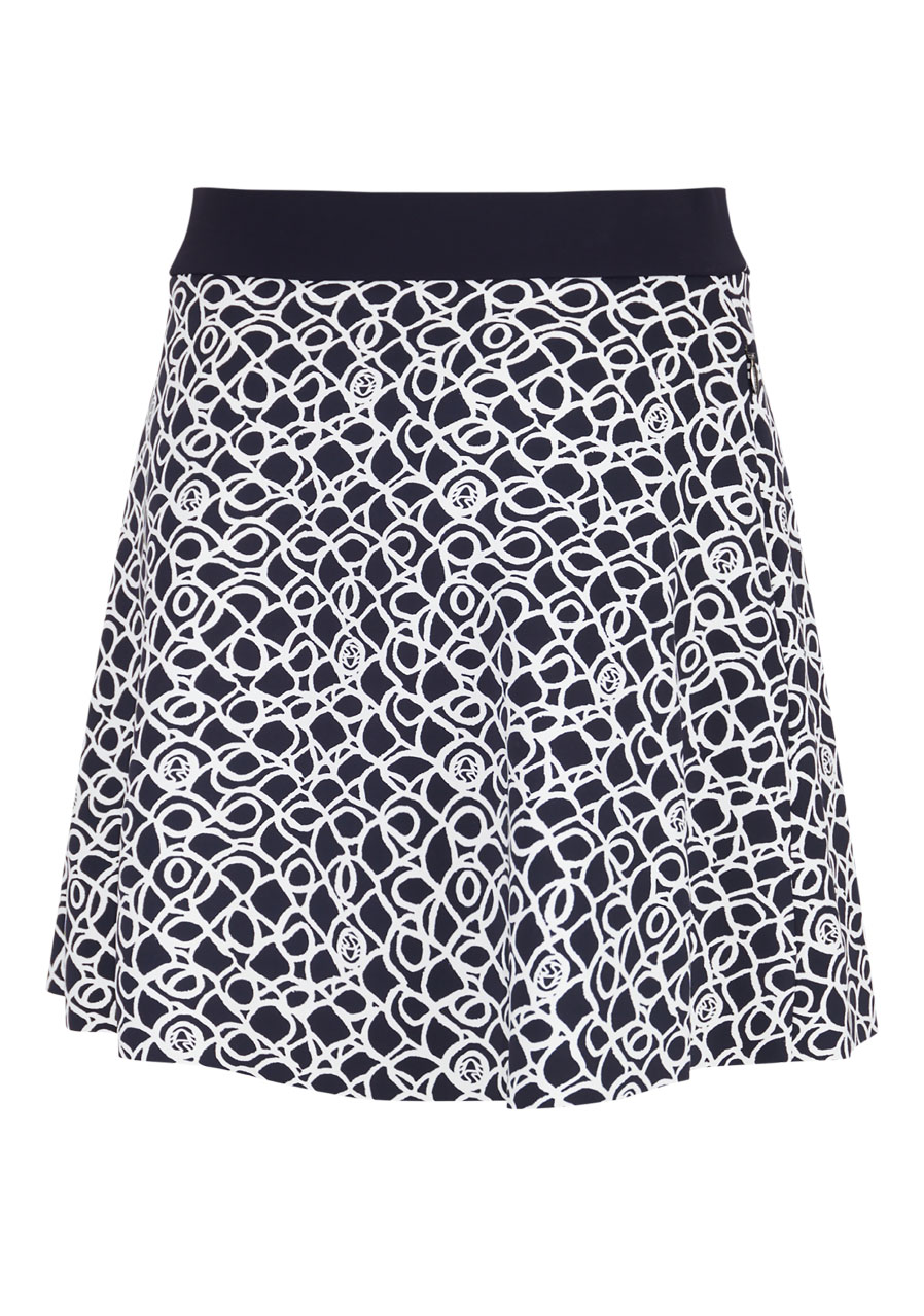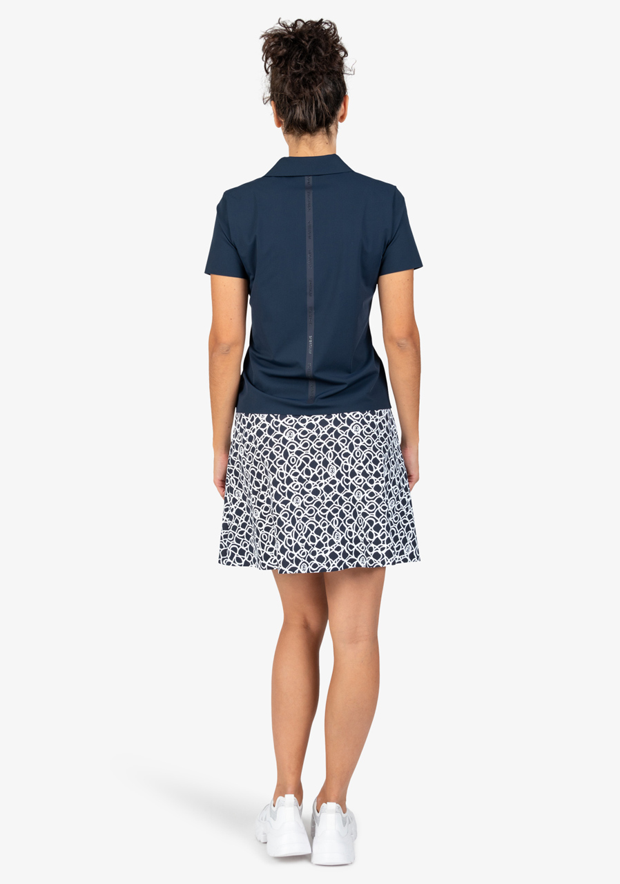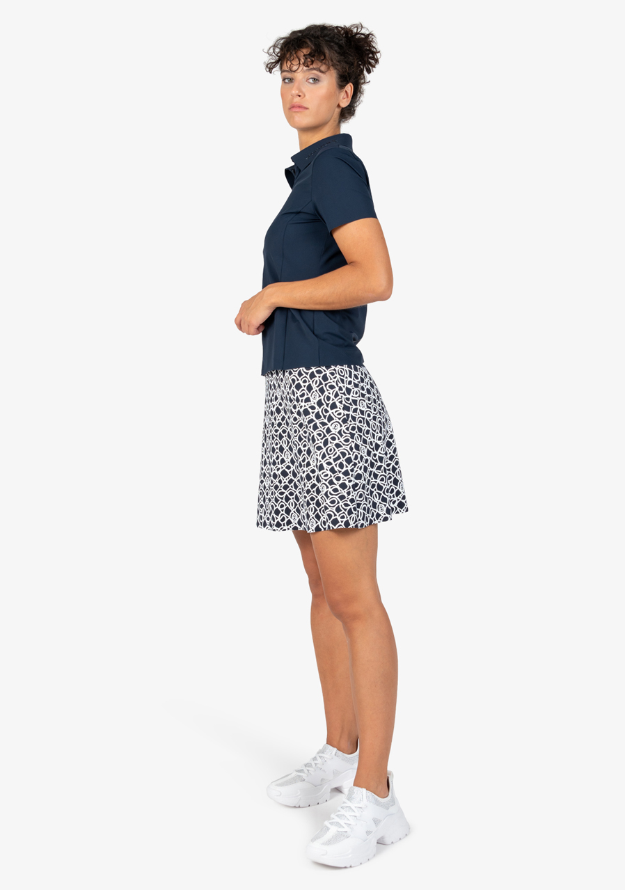 Další parametry: S měkkým elastickým pasem zpracovaným neviditelně a A-line tvarem je sukně pohodlná a zároveň lichotivá. Chytře umístěné vložky a centrální páska dodávají sukní stylový detail, zatímco lem s otevřenými okraji zajišťuje moderní vzhled. Pro praktické využití je na pravé straně skrytá kapsa na zip. Délka sukně pro velikost 36 je 50,2 cm, což zajišťuje ideální délku pro pohodlný pohyb na greenu.