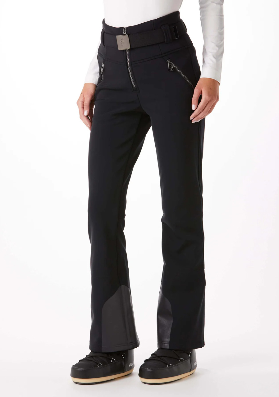 These women's softshell pants in a modern slim fit are designed for active skiers and outdoor enthusiasts who demand performance and style. They are made of premium Schoeller® Comfortshell Structure material, which combines high elasticity, durability and excellent breathability. The fabric adapts to the movement of the body while protecting against cold and moisture thanks to the water-repellent DWR treatment. Anatomically shaped cut with integrated elastic waistband ensures perfect fit and comfort. The pants are equipped with two front pockets, inner snow cuffs with anti-slip rubber and reinforcement at the ends of the legs, which prevents damage from ski edges. YKK® VISLON® zippers with characteristic Delta shaped teeth and 3D logo patch underline the premium look of this model.