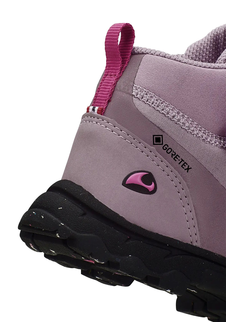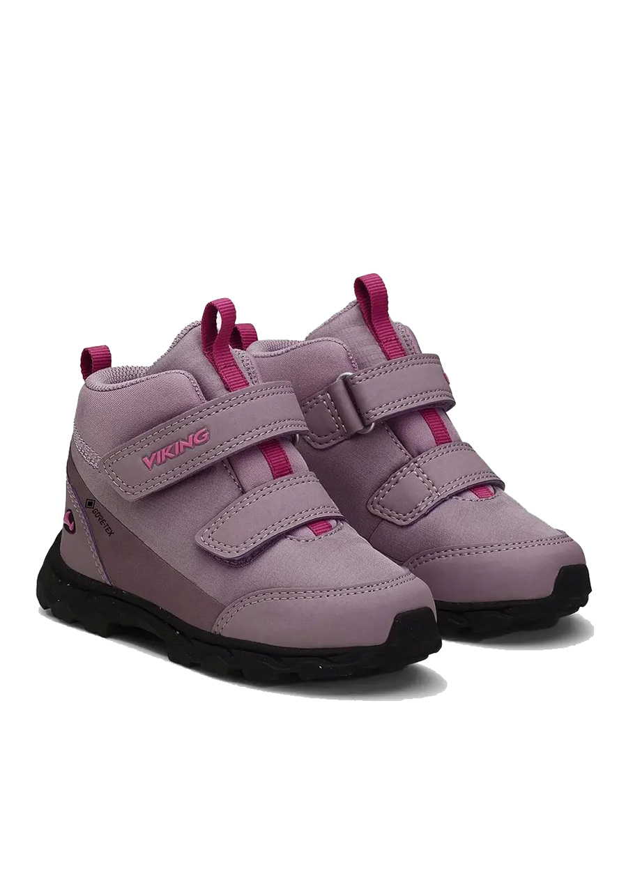 The Viking Ask Mid F GTX children's outdoor boots in a playful Dusty Pink/Magenta color combination are a perfect choice for active kids who need reliable, lightweight, and comfortable footwear for all-weather use. The mid-cut design provides ankle support and protection, while the GORE-TEX® membrane ensures feet stay dry in rain or mud.