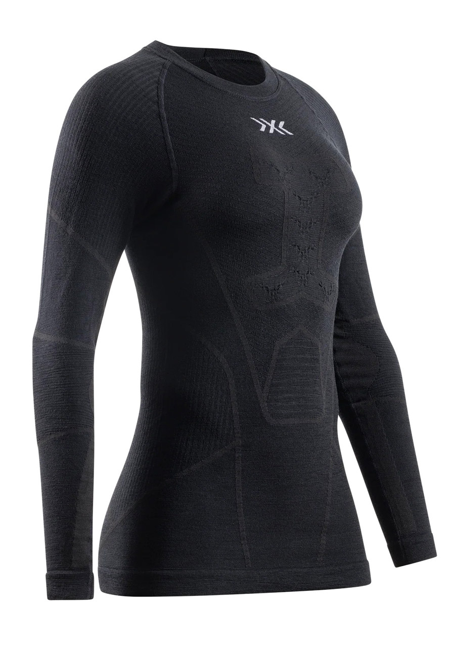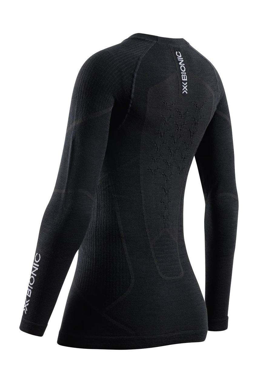 Experience natural comfort and professional warmth. The X-BIONIC® SYMBIO MERINO SHIRT LS WMN combines the softness and thermoregulation properties of mulesing-free merino wool with advanced 3D Bionic Sphere® and ThermoSyphon® technology. These systems ensure precise body temperature management - cool during activity and warm when at rest. Integrated ISO-Pads provide targeted insulation in key areas, maintaining stable warmth even in freezing conditions. The naturally flexible and breathable material supports long-lasting comfort, a dry feeling and maximum performance during winter sports.